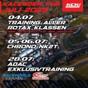 Hier zum Nachlesen unsere Termine im Juli 2025. Am Freitag den 04. gibt es eine Sonderregel: Als Vorbereitung der Chrono 2T Serie findet ein gesondertes Training statt, bei dem nur die Rotax und KZ2 Klassen teilnehmen können. Jeder kann kommen (auch die, die nicht am Rennen teilnehmen).