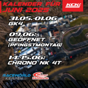 Hier zum Nachlesen unsere Termine und Events im Monat Juni. Wir haben am Pfingstmontag (den 09.06.) geöffnet. Ein guter Trainingstag um sich für die anstehende Chrono NK 4T Serie vorzubereiten. Sie besucht uns am 14.-15 Juni. Ansonsten hat sich die Speisekarte unseres KCK Restaurants nun voll gefüllt und begrüßt sie mit Tagesspeisen vom Snack bis zum Herzhaften.