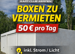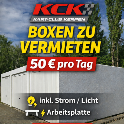 | An unseren regulären Test-/Einstellfahrten können bis zu 3 Boxen gemietet werden. Spare Zeit und erleichtere dir die Arbeit. Unsere Boxen sind mit Strom/Licht, einer Arbeitsplatte und einer Bierbankgarnitur ausgestattet und bieten dir ein komfortables Arbeitsumfeld. Zusätzlich befindet sich der Standort der Boxen in unmittelbarer Nähe zum Vorstart. Die Anmietung der Boxen erfolgt einfach und bequem über die KCK-Geschäftsstelle per E-Mail oder Telefon oder vor Ort bei unseren Bahnwarten (sofern verfügbar). Bei Rennveranstaltungen stehen die Boxen nicht zur Verfügung. | |